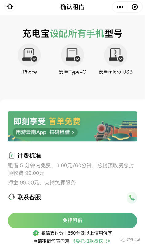 “小云电”充电宝设配所有手机型号,租借5分钟内免费,3元/小时,总封顶收费为99元,押金为99元,微信支付分550以上信用支持免押金服务。