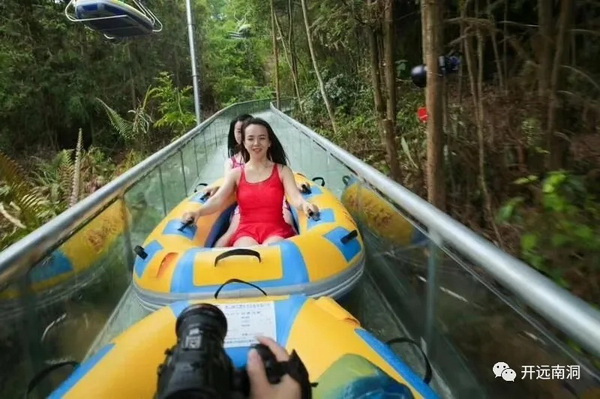 玻璃滑道位于南洞风景区南天门景点,全长约300米,滑道采用S型设计,遇自然景点和树木盘绕而行。