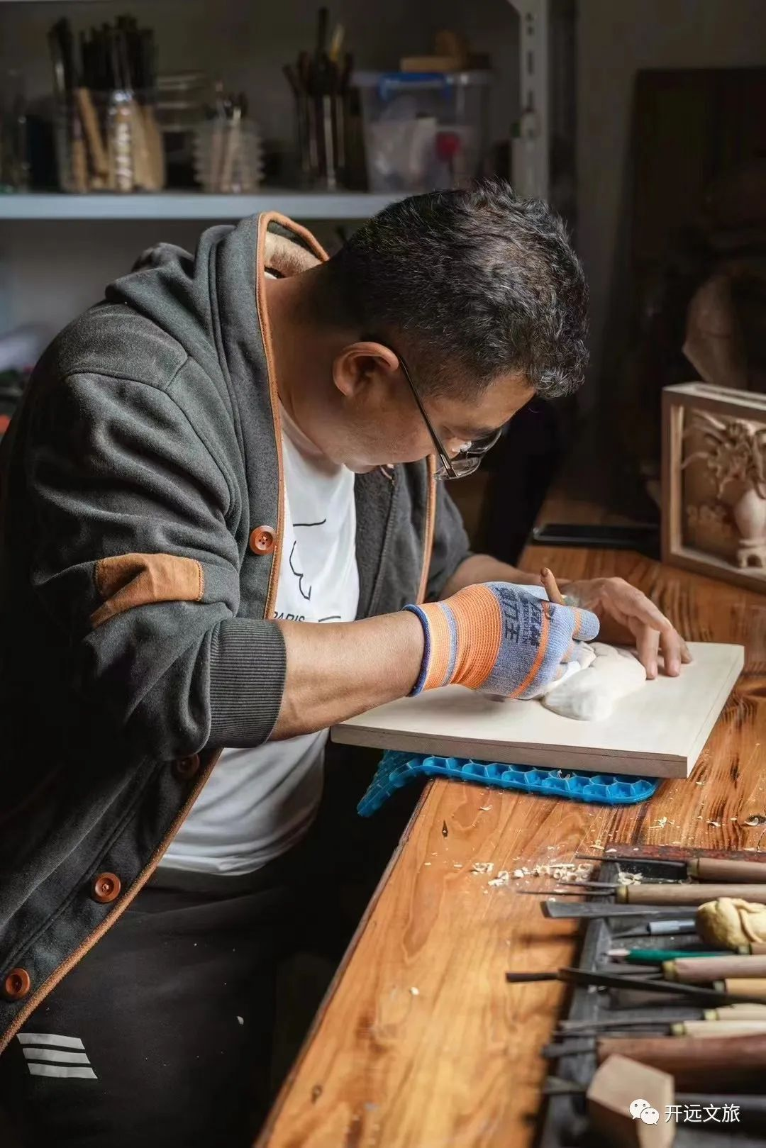 △怪之艺琢木坊主理人“老怪”,本名徐连强。没有经过任何专业训练的徐连强,凭借自身对中国传统文化艺术的喜好和悟性,30余年来一直致力于木雕,陶艺,绘画的创作和研究。2013年师从云南省工艺美术大师邢立军,技艺更有了精进。2014年组建“怪之艺琢木坊”工作室,在艺术追求的道路上继续砥砺前行。