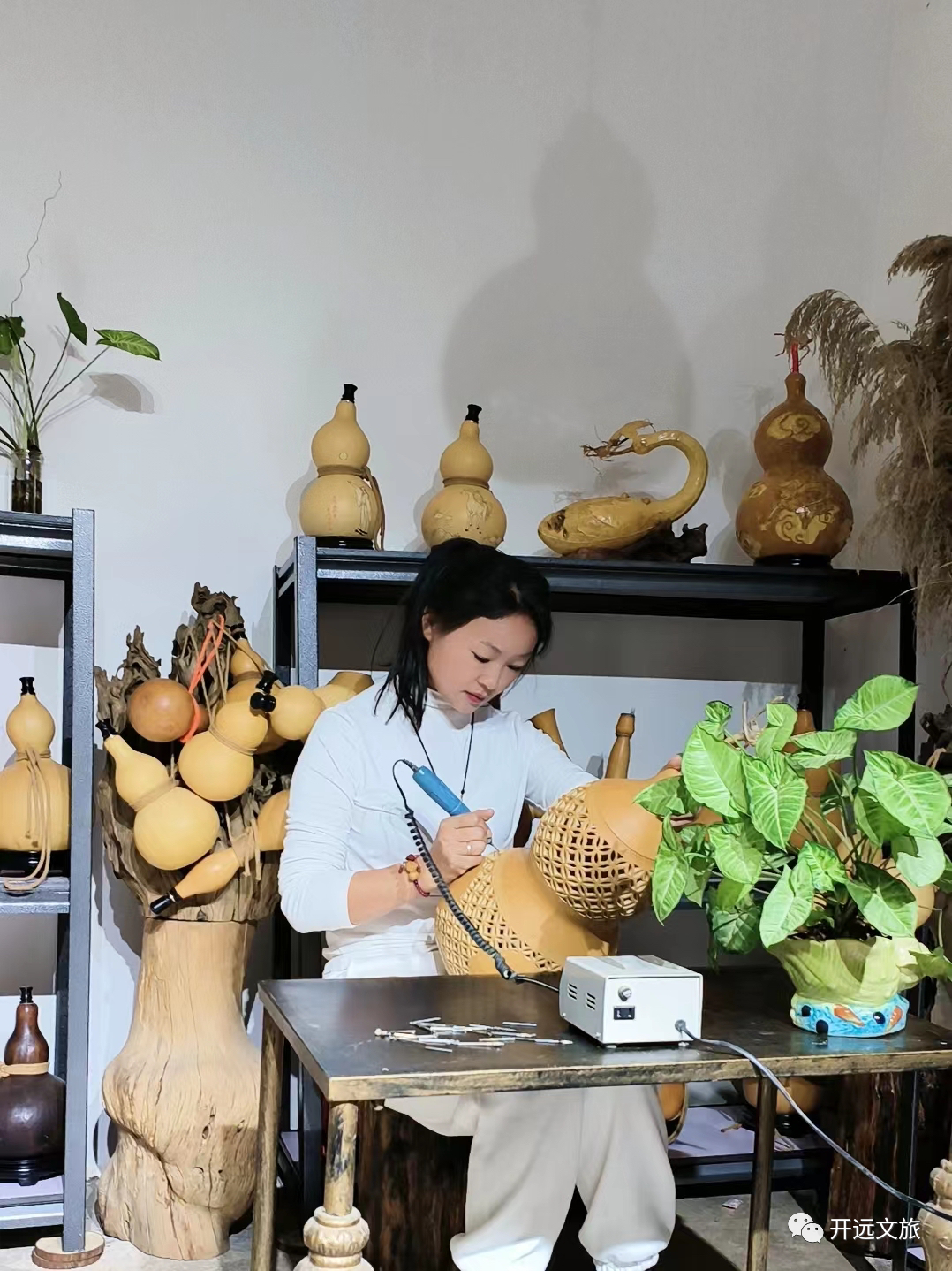 △丽缘葫艺工作室主理人赵丽,有“葫芦姐姐”之美称。,她通过阳刻、阴刻、镂空等工艺,将原本普通的葫芦做成生活中适用并且具有艺术气息的葫芦灯,具有中国传统文化元素的图案,组成了具有中国韵味的灯饰品,拓展了民间艺术品的商业渠道。