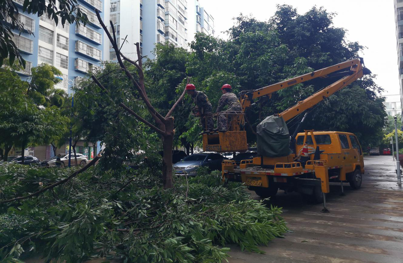 图为修剪工人在万达华府停车场修剪被狂风刮断树枝