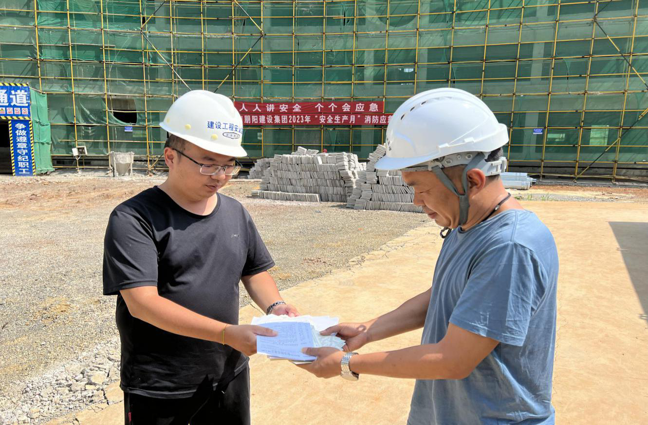 图为在建筑工地发放安全生产宣传手册