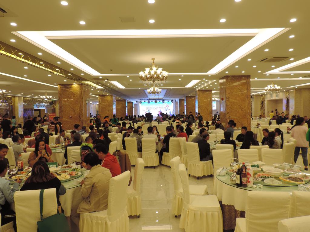 走进新东城农贸市场,乘观光和直达电梯进入三楼,新贵典雅的“欧派黄”给人以耳目一新的感觉。140张方桌整齐排列,LED显示屏、彩灯、金属质感音响以及婚庆的背景灯光、舞台效果,都给人一种高雅时尚的感觉。