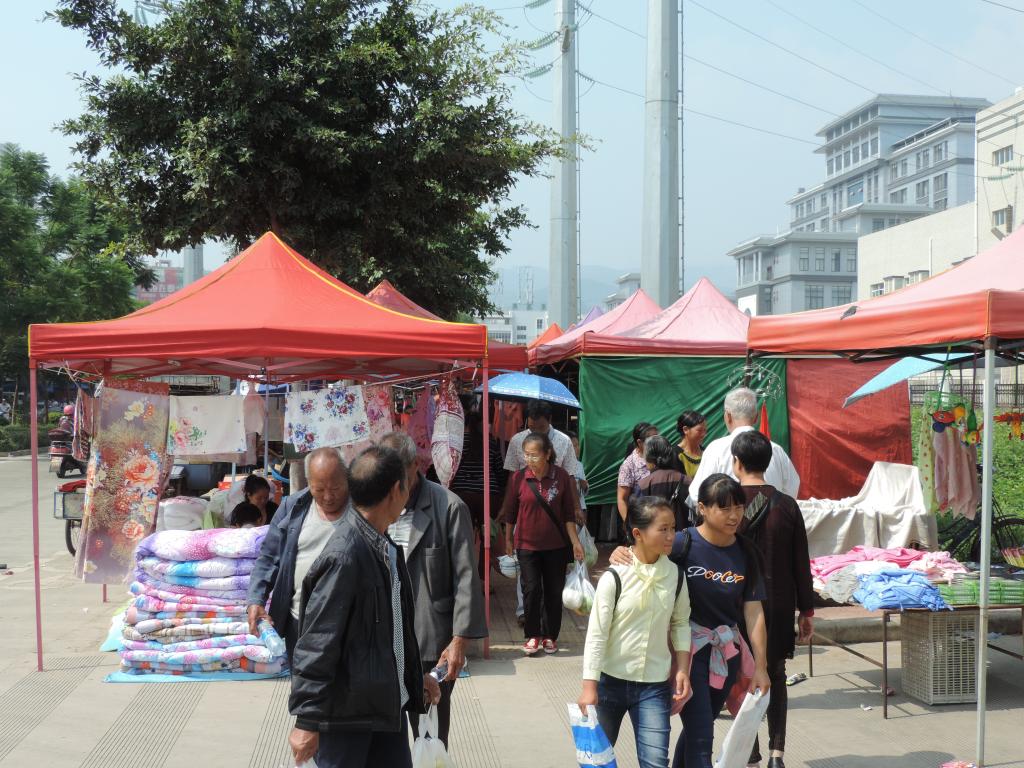 上周日上午10点30分起,记者从落云南路,经云龙路、人民南路、灵泉西路再回到落云南路与灵泉路的交叉路口,发现超过3公里长的4条道路上都不同程度地存在以路为市、沿街买卖的现象,并且多个路段双侧人行道均有经营行为。山货、水产、干货、杂货、蔬菜、水果以及新的、旧的各类商品,仿佛就是一个综合市场。到这里来买卖的,有本地的,也有外地的。