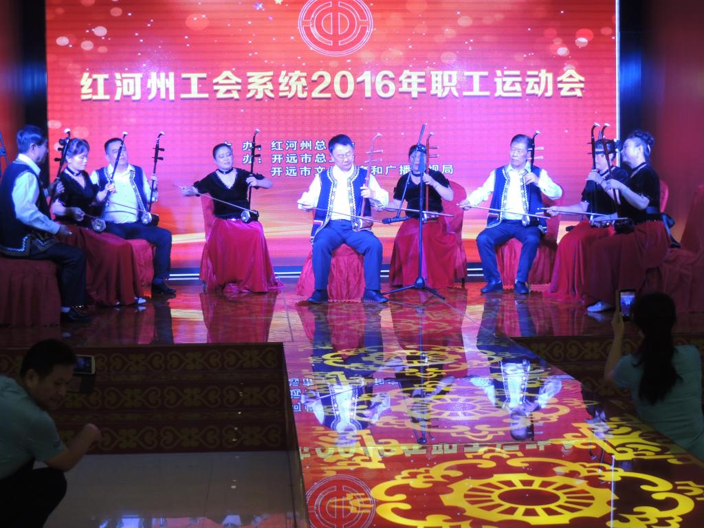 开远市总工会职工在表演二胡联奏《八月桂花遍地开》