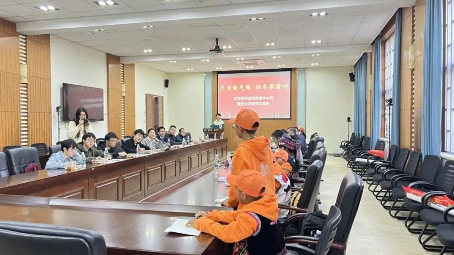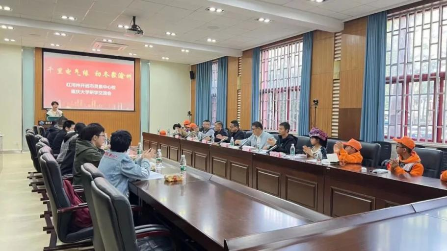 在校内研学座谈会上,重庆大学电气工程学院新材料系党支部书记张谦副教授、副主任汪金刚教授向同学们展示了重庆大学的人文魅力,学校教师默默奉献、桃李育人的精神风貌。重庆大学电气工程学院6名硕士研究生、博士生以自身经历传授同学们学习经验,讲解起了重庆代表性民俗文化,同时就如何树立爱党、爱国的远大理想做了重点交流。8名青少年学生为重庆大学电气工程学院师生现场跳起了颇具开远少数民族特色的《西山苗家娃》大课间舞蹈。