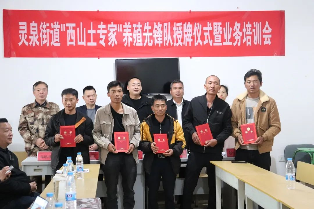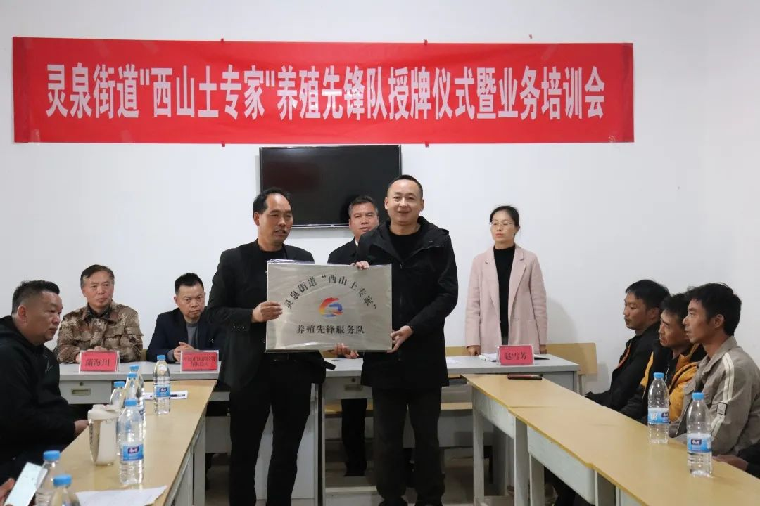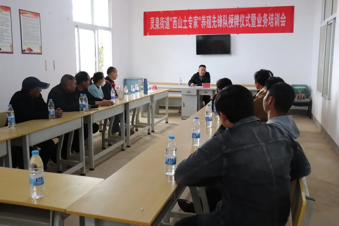 12月8日,灵泉街道在那丕村召开“西山土专家”养殖先锋队授牌仪式暨业务培训会,街道党政主要领导及部分班子成员、开远市国洪经贸有限公司相关负责人及40名养殖“土专家”参加会议。