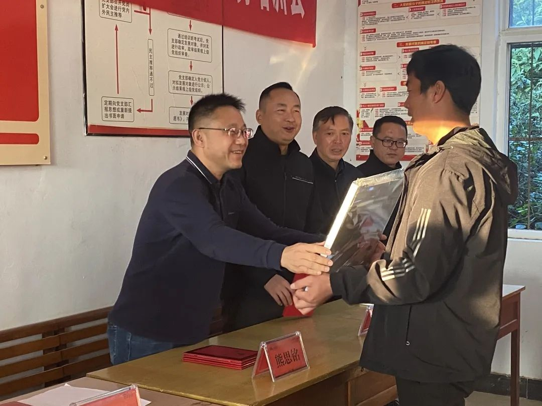 街道党工委书记邰剑平向“西山土专家”养殖先锋服务队队长王勇授牌