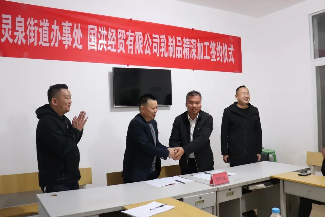 最后,街道党工委副书记、办事处主任王应和与开远市国洪经贸有限公司法定代表人袁国洪签订乳制品精深加工协议。开远市国洪经贸有限公司法定代表人袁国洪与鑫羊养殖专业合作社社长王勇签订鲜乳收购协议。