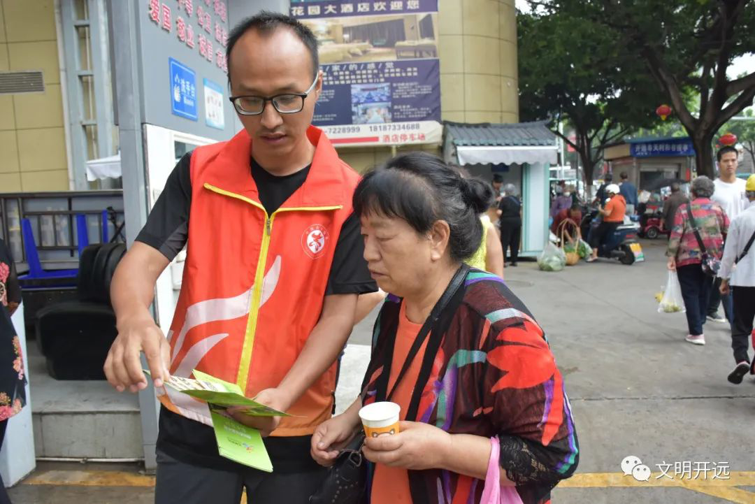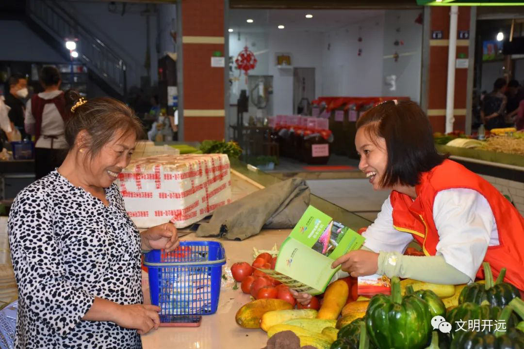 志愿者们走进东城集贸市场,向周边商铺和过往市民发放宣传资料,宣传文明城市的有关知识,倡导大家积极参与到创建文明城市的工作中来,自觉规范个人言行、维护市容市貌环境、爱护公共设施、诚实守信经营,争做文明风尚的传播者、文明创建的实践者。