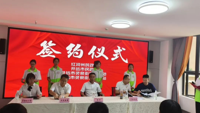 红河州民政局二级调研员杨洋同志,市委常委、市委政法委杨卫明书记、市人民政府汪永安副市长、市民政局李原局长、灵泉街道办事处党工委邰剑平书记以及市级相关单位部门领导、医院、企业、社会组织代表、灵泉街道辖区内(村)社区的相关负责同志、驻站社工、志愿者等60余人共同参与本次启动仪式。