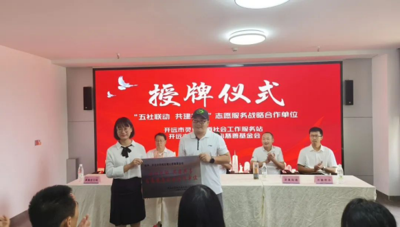 灵泉街道社会工作服务站授予开远市同根生爱心慈善基金会“五社联动 共建共享”志愿服务战略合作单位牌匾。