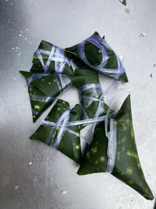 活动现场,伴随着粽叶的阵阵飘香,大家齐动手共参与,捋粽叶、做漏斗状、填糯米、压紧实、封口、扎捆,巧手翻飞,粽叶飞舞、欢声一片,忙得不亦乐乎,很快一个个结实饱满的粽子便包好了,包出的粽子既有传统样式,又有大胆创意创新,浓浓的粽香弥漫整个活动现场。