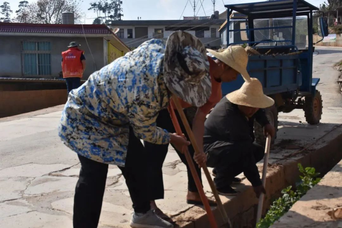 大家捡垃圾、扫落叶,认真清理每个死角,在大家的努力下,村庄面貌焕然一新。