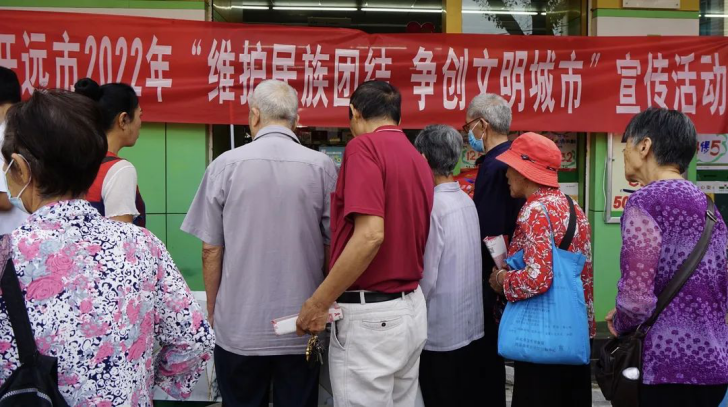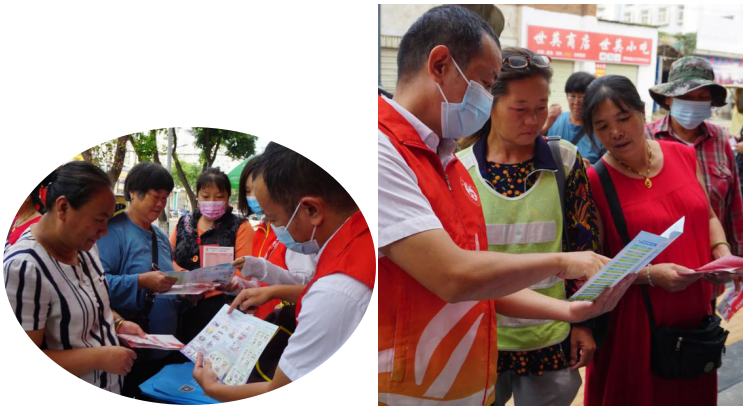 活动中,志愿者向过往居民派发民族政策相关知识折页、创文宣传折页、围裙、环保袋等。