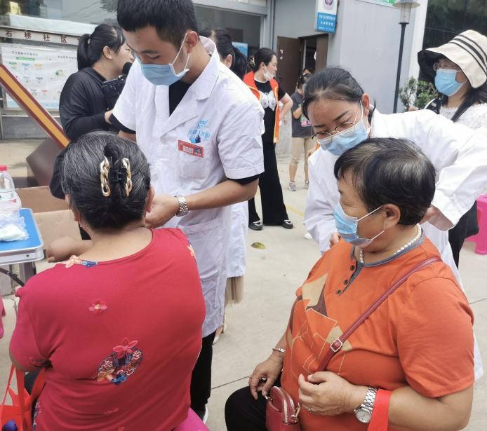 同学们为社区老人送上真切的祝福,医护人员为老人进行身体检查、咨询,以守护老年人健康生活,为祖国华诞送上美好祝愿。