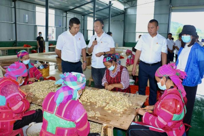 藠头分拣中心现场,举办碑格乡村集体经济份额确认仪式,碑格乡碑格、落坡洞、架吉、鲁姑母4个村委会经济组织被授权对藠头分拣中心进行运营管理,并分获2022年租赁收益。仪式结束后,参加仪式人员进入厂房了解运营管理模式以及藠头分拣中心的建立对当地群众收入所带来的增益。