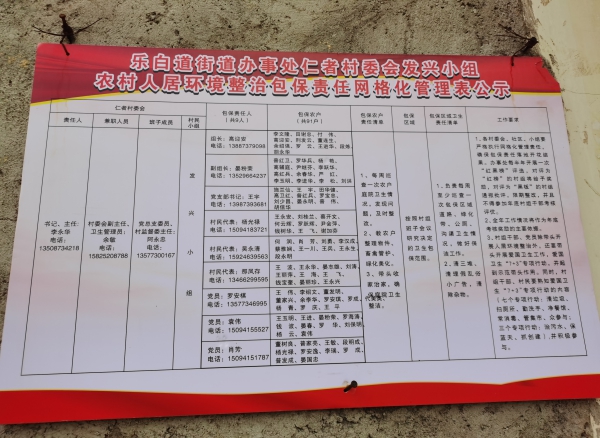 在全街道121个村(居)民小组最醒目的位置粘贴各小组人居环境整治包保责任网格化管理表公示展板,建立健全横向到边、纵向到底的网格化卫生管理制度,对所有农村道路、公共区域、公厕、卫生角落及所有农户实施全方位无死角的卫生包保责任落实;在职党员干部、工作人员下沉到基层一线,充分发挥各级人员队伍力量,紧盯问题抓整改,实行挂账销号管理,群策群力想办法、齐心协力整改问题;同时建立宣传教育培训机制,注重发挥关键少数的作用,以点带面,促进爱国卫生和农村人居环境工作的最新要求变成广大基层干部群众的生动实践。