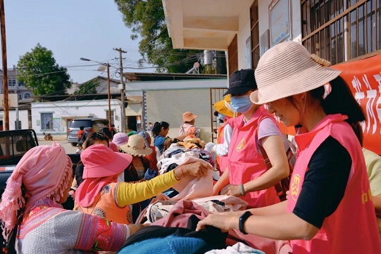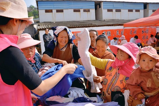 捐赠现场气氛持续火热,老邓耳村村民纷纷聚集到广场,志愿者们将提前清洗干净的衣物折叠整齐摆放在桌上供村民挑选。衣暖人心,村民们都露出了喜悦的笑容。