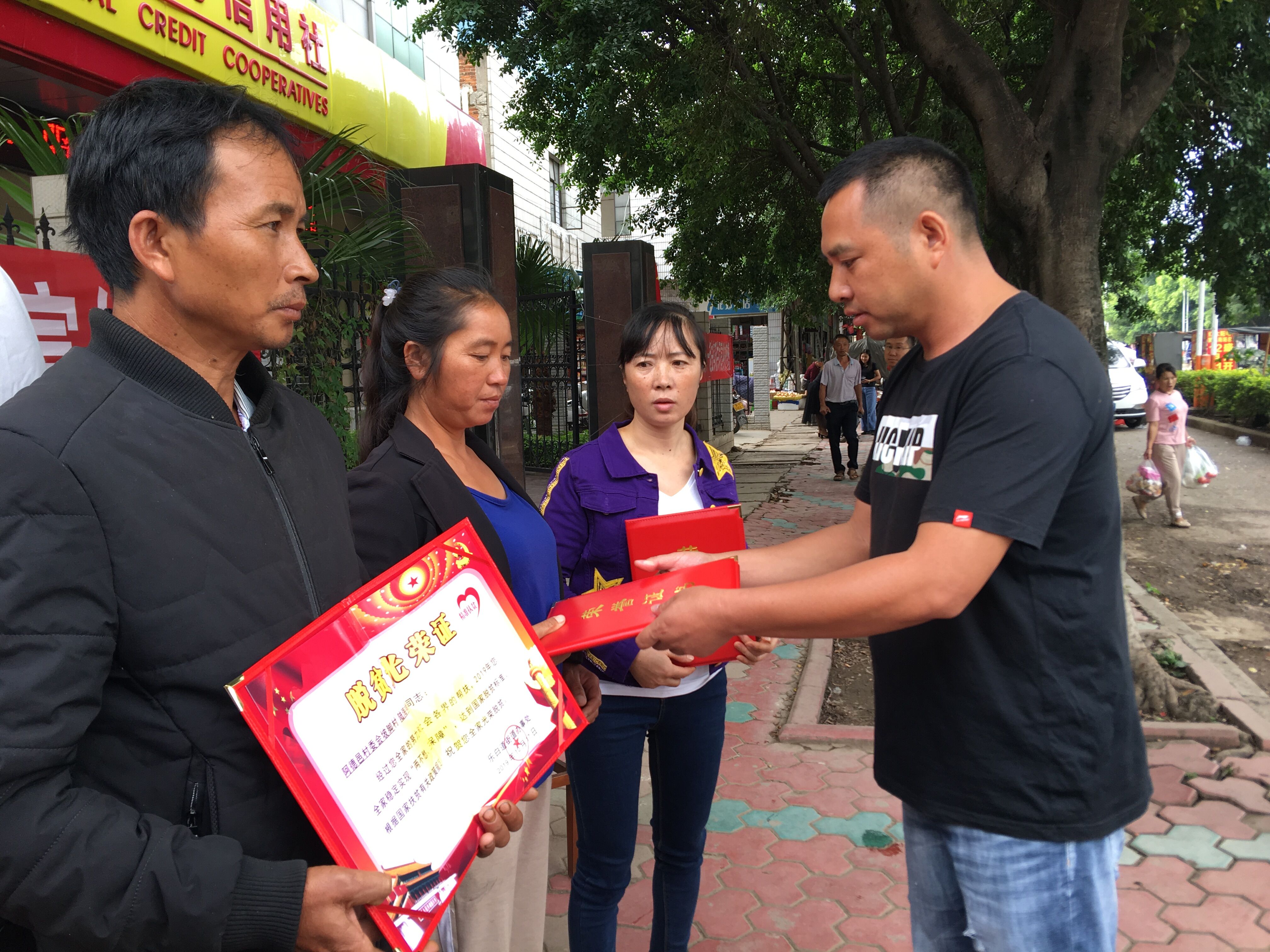 在新寨村委会的活动点上,相关人员向过往群众发放了健康扶贫政策、教育扶贫资助政策、助残政策等宣传资料,同时提供免费测量血压的服务;之后为该街道前期评选出来的15户脱贫光荣户中的5户脱贫光荣户代表举行了简短的表彰仪式,为他们颁发奖状和奖品,鼓励他们继续巩固脱贫成效、发挥表率作用。而该街道其余涉贫的村委会(农村社区)也结合实际开展了相关的宣传和对其余10户脱贫光荣户进行表彰。
