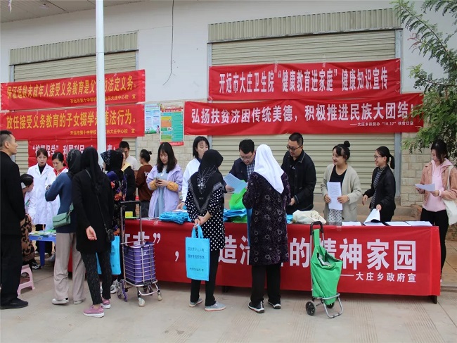 2019年是高质量推进脱贫攻坚“歼灭战”“清零战”关键一年,10月17日是全国第六个扶贫日。为切实开展好“10·17”扶贫日系列活动,完成“百日行动”决战年度目标,在全乡营造人人关心、人人参与、人人支持的脱贫攻坚浓厚氛围,10月16日,大庄乡组织乡扶贫办、乡残联、新农合办、乡劳动保障、大庄卫生院、开十中、大庄中心校、乡团委、乡妇联等十余家相关部门工作人员在大庄农贸市场门前统一设立宣传咨询台,通过拉横幅、摆放宣传板报、发放扶贫政策宣传资料、现场解答群众咨询等群众喜闻乐见、易于接受的形式,集中开展以“邀您一起合力攻坚,夺取脱贫攻坚全面胜利”为主题的精准扶贫宣传咨询服务活动。