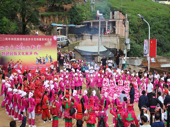 7月26日,(农历六月二十四),大庄乡老寨村委会新寨村举行庆祝新中国成立70周年和民族团结进步示范创建系列活动之2019“燃情火把.欢聚新寨”特色民族文化展演。活动以突出“共同团结奋斗、共同繁荣发展”为主题,进一步做好民族团结进步示范州创建工作,激发各族同胞团结奋进、开拓创新,为全面建成小康社会而努力。