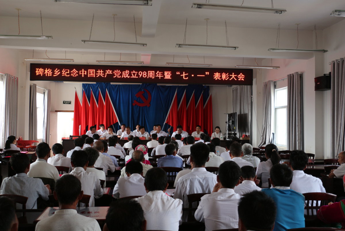 七月的天空流光溢彩,七月的大地遍地飞歌,在中国共产党迎来建党98周年之际,碑格乡召开庆祝建党98周年暨“七一”表彰大会,对过去一年里在党的建设、脱贫攻坚、经济社会全面发展中涌现出来的先进集体、优秀共产党员和党务工作者进行表彰。
