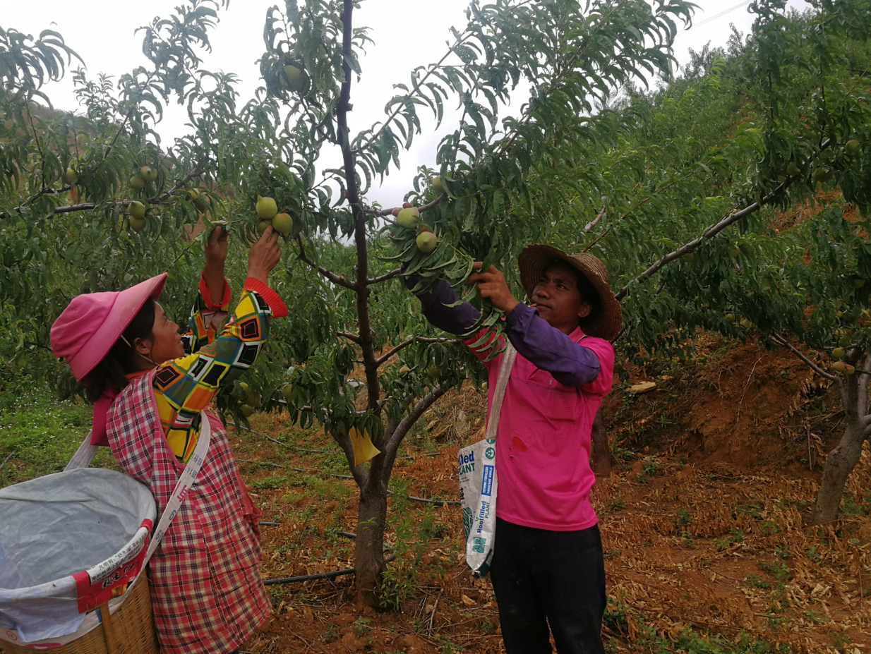 一袋袋成熟的桃子不断从桃林中采摘出来,运到路边,再经过分拣、装筐后由桃农或商贩运送到开远的各个农贸市场、超市及其他县市,深受各地客商和广大消费者的喜爱。杨春田说:“今年他家一共种了15、16亩鹰嘴蜜桃,今天是第四次采摘,差不多有上千公斤,明天还有外地的商贩要来收购。今年由于天干,挂果率低,但是价格比去年好,最小号果子去年批发价0.8元至1元到今年3.5元至4元,中号果子去年的批发价5或6元到今年9或10元,大号的果子去年批发价11或12元到今年15或16元,比起去年有好几块钱的涨幅,到目前已经有差不多2万元的收入了。”