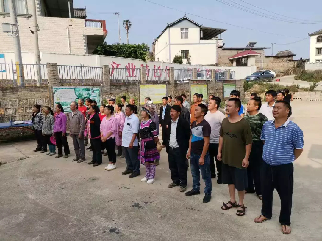首先在三转弯村的活动场地上举行了升国旗唱国歌仪式,随着嘹亮的国歌声奏响,所有人员神情专注、严肃,深情凝视鲜红的国旗冉冉升起。升旗仪式后,村委会主要负责人联系村委会实际和近年来各方面发生的变化,进一步宣传了脱贫攻坚相关政策,激发党员干部群众“不忘党恩、跟党走”的激情,树立爱党爱国爱家乡的感恩意识;在道德微宣讲活动上,大家就村委会13个自然村的村内环境卫生、孩子的教育、生活陋习等方面问题,展开了面对面的大讨论,并且通过开展批评与自我批评活动,以良好的家风来带动淳朴民风,促进文明乡风;开元法律事务所所长马立颖声情并茂地宣讲了控辍保学和扫黑除恶的相关政策和应知应会小常识,并结合实际案例,以案释法,让村民们清楚的明白什么是“黑”,什么是“恶”,进一步提高大家扫黑除恶的意识和觉悟。同时,为了让大家听得懂、听明白,苗族大学生村官杨军辉用苗语和汉语两种语言讲解了革除陋习、乡风文明的重要性。