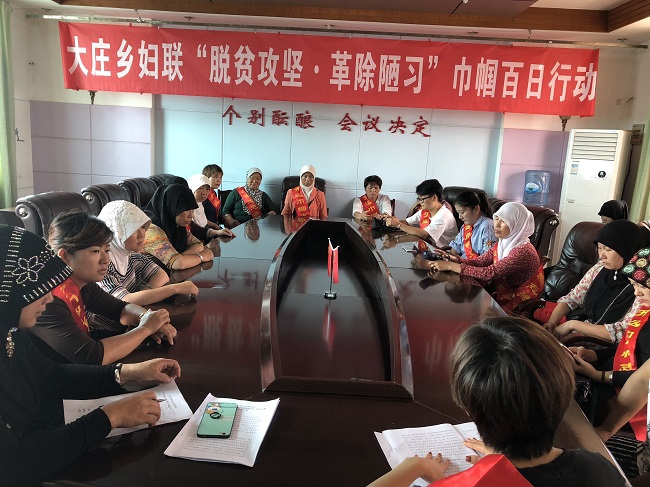 为打好打赢精准脱贫攻坚战,发挥妇联组织优势,大庄乡妇联积极组织妇女投入“开远市2018年‘完成全年扶贫目标任务百日行动’”,8月16日,组织大庄村妇联干部及妇代小组长召开动员会,成立了一支由25名妇女组成的巾帼志愿服务队开展美化家园、整治环境卫生活动,启动“脱贫攻坚·革除陋习”巾帼百日行动。
