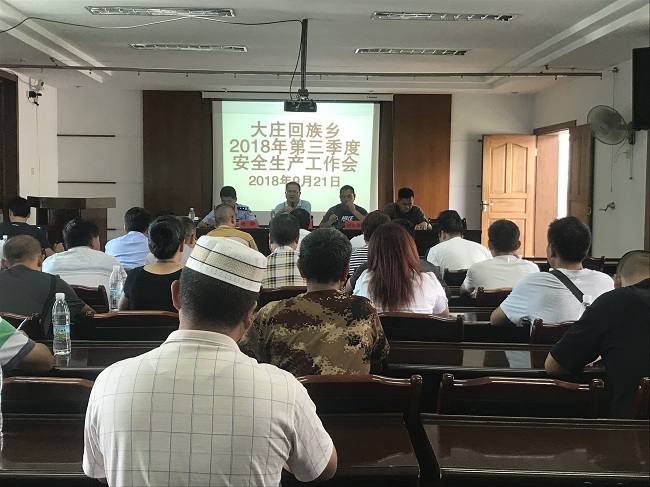 9月21日,大庄乡组织召开第三季度安全生产工作会议,对全乡近期安全生产大检查工作开展情况进行通报并分别对第四季度安全生产、道路交通安全、农机安全、消防安全及 “中秋、国庆”期间安全生产工作作了安排部署。乡主要负责领导、各村委会、各相关站所(办)、学校、清真寺及各有关企业负责人共50余人参加。