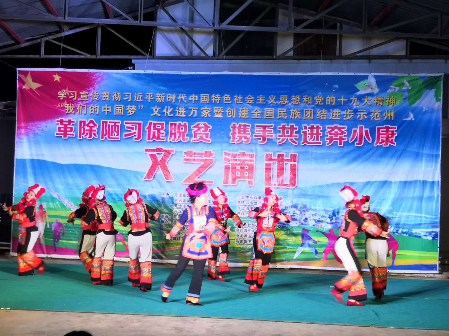 此次文艺汇演活动紧紧围绕党的十九大精神、精准扶贫、提升人居环境、革除陋习等主题,精心编排了广受群众喜爱的节目。表演节目共计75个,其中,小品《革除陋习树家风》用生动的表演展现了革除陋习对生活的意义;舞蹈《我的家乡最美丽》则凭借演员们柔美的舞姿给现场群众留下了深刻的印象。旗袍秀《旗袍美人》、烟盒舞《彝家欢歌》等一个个精彩的节目轮流登台,看得老百姓们激情澎湃。现场欢笑声、喝彩声、掌声不断。本次演出利用节目间隙进行精准扶贫政策、村规民约等一系列知识要点宣传,使群众接受零距离的革陋习促脱贫宣传教育。此外,工作人员发放精准扶贫政策宣传贴画,让群众对各项惠民政策有更深的了解。演出结束后,几位老人说道“太热闹了,简直就和我们在家里看电视一样,演员们的表现太精彩了,和过年的气氛一样”。