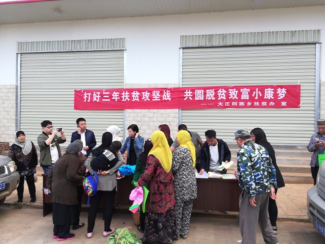 为切实开展好扶贫日系列活动,完成“百日行动”决战年度目标,在全乡营造人人关心、人人参与、人人支持的脱贫攻坚浓厚氛围,10月18日,大庄乡扶贫办、乡残联、乡计生办、乡文化站、乡妇联、大庄卫生院、学校等十余家相关部门工作人员在大庄农贸市场门前统一设立宣传咨询台,通过拉横幅、摆放宣传板报、发放扶贫政策宣传资料、义诊、现场解答群众咨询、大喇叭播放宣传政策等群众喜闻乐见、易于接受的形式,集中开展以“打好三年扶贫攻坚战 共圆脱贫致富小康梦”为主题的精准扶贫宣传咨询服务活动。