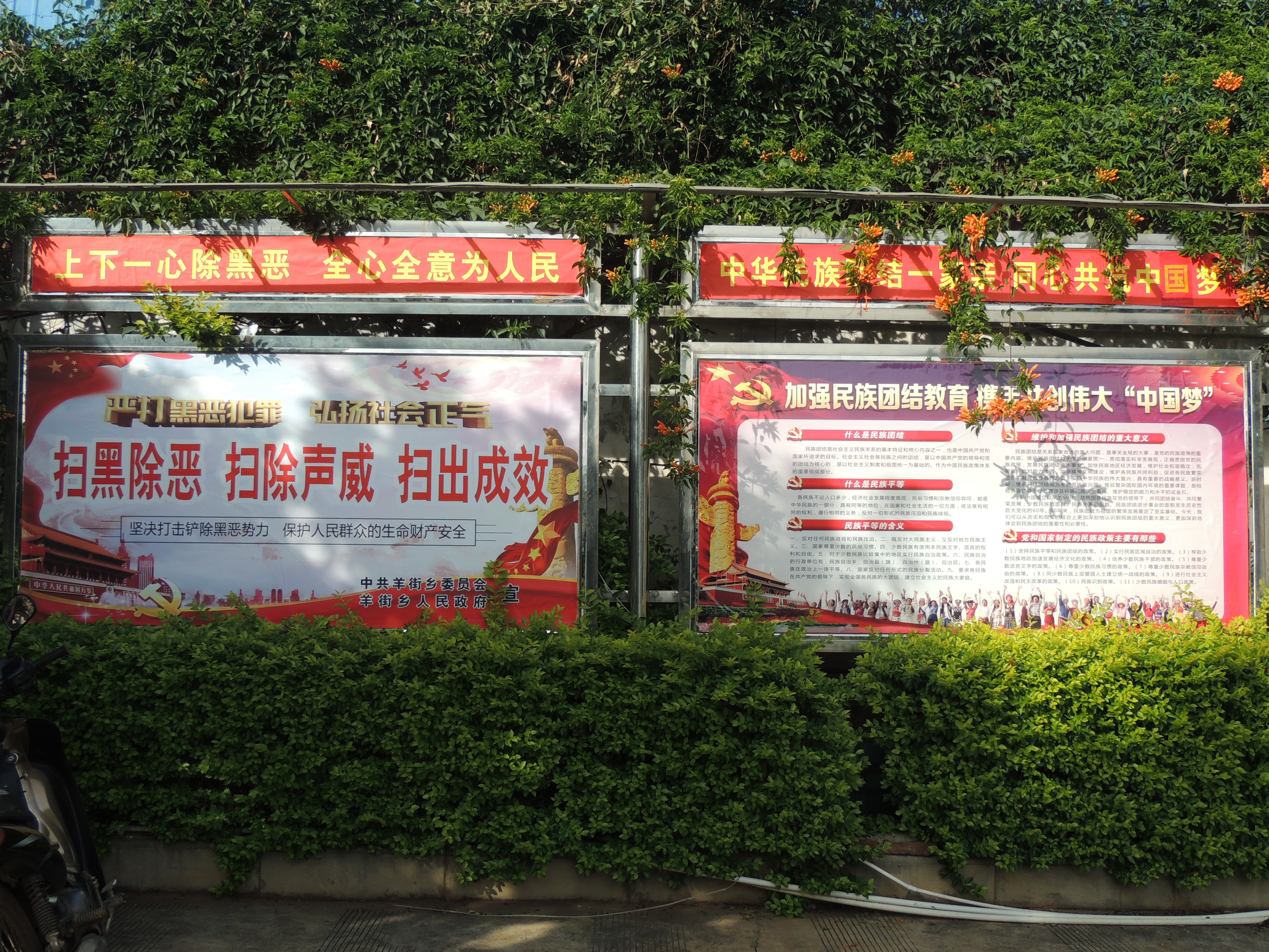 为深入开展扫黑除恶专项斗争,切实保障人民群众合法权益,维护辖区和谐稳定,羊街乡通过开展多形式宣传,营造浓厚的扫黑除恶舆论氛围。此次扫黑除恶宣传工作结合我乡实际,充分利用大型路标广告牌、宣传栏、黑板等多种载体加强宣传,让群众充分了解扫黑除恶的相关法律知识,并引导广大群众遵守法律法规。同时,各村(社区)及各单位充分利用本辖区、本系统的宣传载体加大宣传力度,实现了村组有通告、各村社区有专栏,进一步扩大宣传广度和深度。目前,共投大型户外路标广告牌30个、悬挂宣传横幅13条、放置村内宣传展板7块、班车站台展板16块,通过平台发送扫黑除恶宣传短信300余条。此外,此次宣传活动广泛发动各村(社区)、各单位以及志愿者、社会组织等参与到社会宣传中来,制作宣传黑板报8幅,播放宣传广播30余次,派发宣传单及小册子400份,粘贴海报100余幅,定制粘贴了300份包含扫黑除恶简介、黑涉恶类型、乡举报方式、奖励办法等内容的扫黑除恶宣传公告,切实将扫黑除恶的宣传内容送到人民群众眼皮底、耳朵边,做到随处可见,推动宣传工作有力下沉。