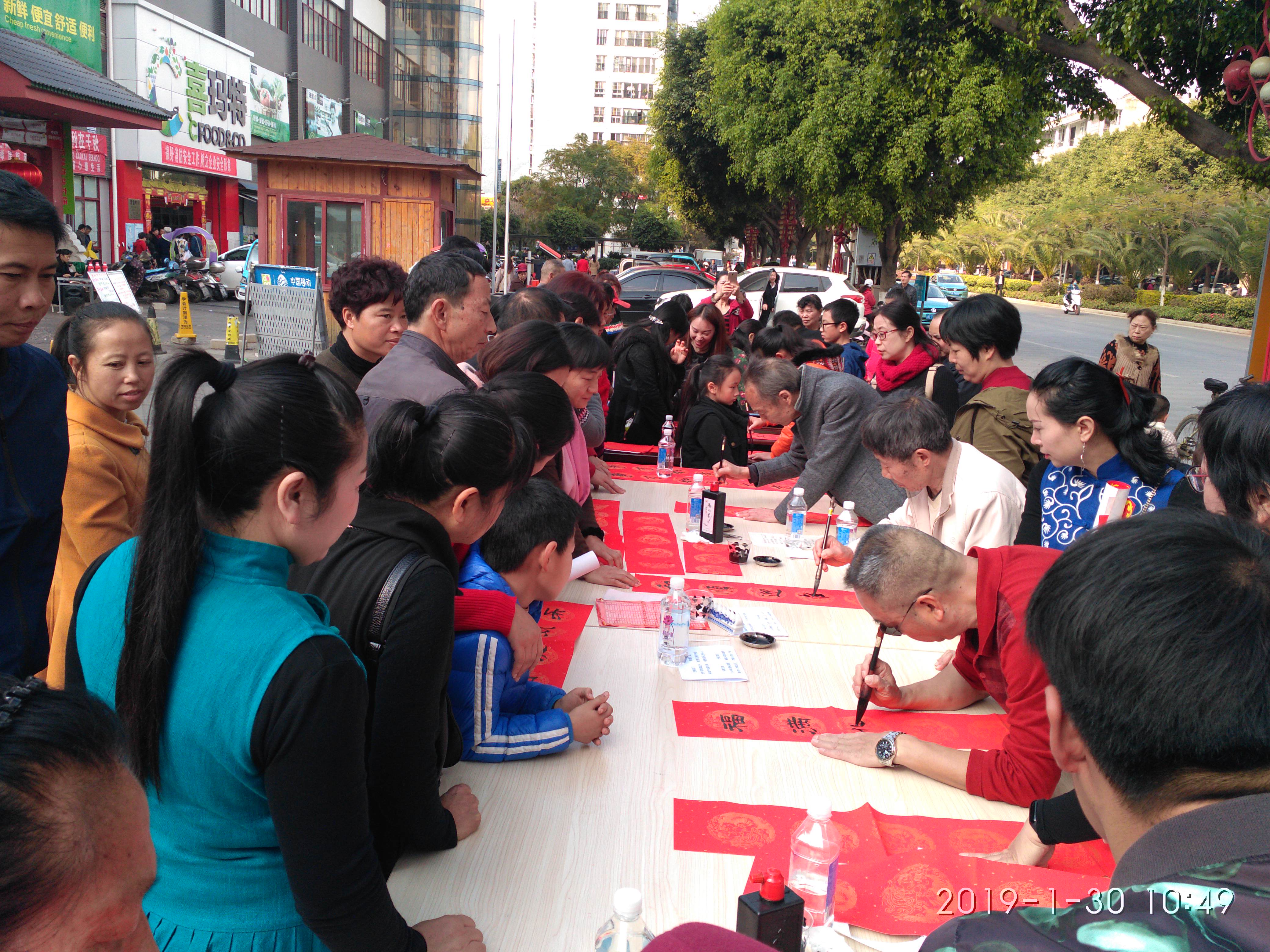 活动现场,市书法协会的6位书法家摆开书案、铺开红纸,当场为居民挥毫泼墨,一个个“福”字,一幅幅春联,为即将到来的新年增添了浓浓年味;市筝琴缘古筝协会的老师为到场的居民表演了文艺节目;街道计生办的工作人员为社区17户特殊家庭送去米油及新年祝福,整个活动始终洋溢着团结和谐、共迎新春的喜庆气氛。过往的行人和到场的居民们兴致勃勃地观看书法家们书写春联,欣赏赠送的春联福字和精彩的文艺节目。随着活动的深入进行,前来排队领春联的群众越来越多,巾帼志愿者们将春联、福字等送到群众手中,获得了群众的广泛好评。