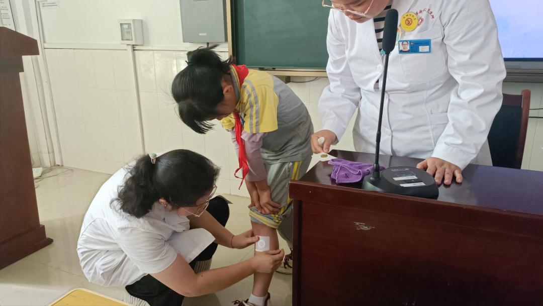 同时,中医医师将传统文化融入课堂,用“小穴位大作用”的故事激发学生兴趣。现场演示了按压合谷穴缓解头痛、揉按足三里增强体质的实用技巧,同学们迫不及待地在自己身上找到对应的穴位,用指尖轻轻按压,感受不同穴位带来的不同体验。有的让人感到舒适放松,有的则微微酸痛,但都是身体在回应他们的触摸。同学们还体验了中药贴敷,体会到了中医养生的乐趣,在丰富多彩的互动中他们不仅学到了丰富的中医知识,也感受到了中医智慧的魅力。