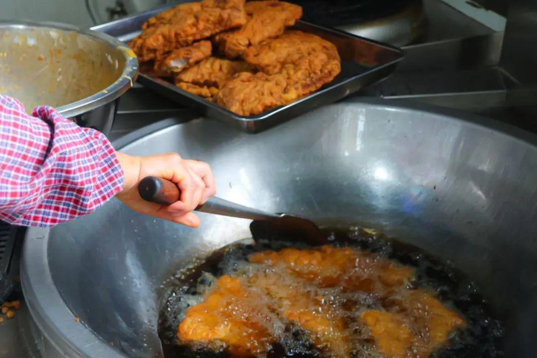 腌制好的肉块需要静置1小时左右,让调料进一步渗透。与此同时,开始准备油炸。在黑泥地社区,绝大多数居民家中都有一口特制的大铁锅,这口锅不仅容量大,而且受热均匀,是制作大酥的绝佳工具。将适量的菜籽油倒入锅中,菜籽油独特的香味能与猪肉的味道完美融合。开大火将油烧至七成热,判断油温是否合适有个小窍门:可以用筷子插入油中,如果周围立刻冒出细密的小气泡,就说明油温达到了要求。