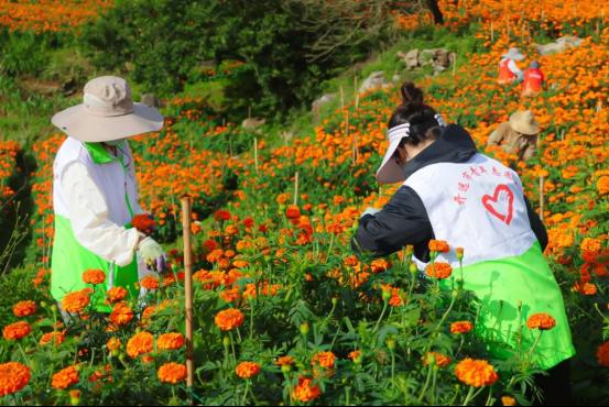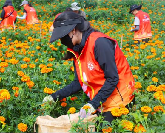 此次志愿服务活动,经过近四个小时的劳动,采收万寿菊6亩3000公斤。一袋袋金黄的万寿菊承载着汗水与期望,进入收购点后将直接转化为脱贫群众实实在在的经济收益。
