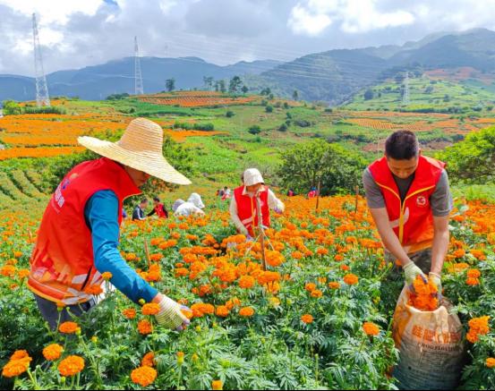 得知相关情况后,乡党委及时回应,把解决王云龙一家的燃眉之急作为践行为民办实事的具体实践。7月31日清晨七点半,42名由乡机关党员干部、民兵、马桑箐村“两委”班子成员、驻村工作队员组成的志愿队伍集结完毕后,马不停蹄直奔王云龙户花田,迅速有序投入到采收万寿菊的志愿服务实践中。