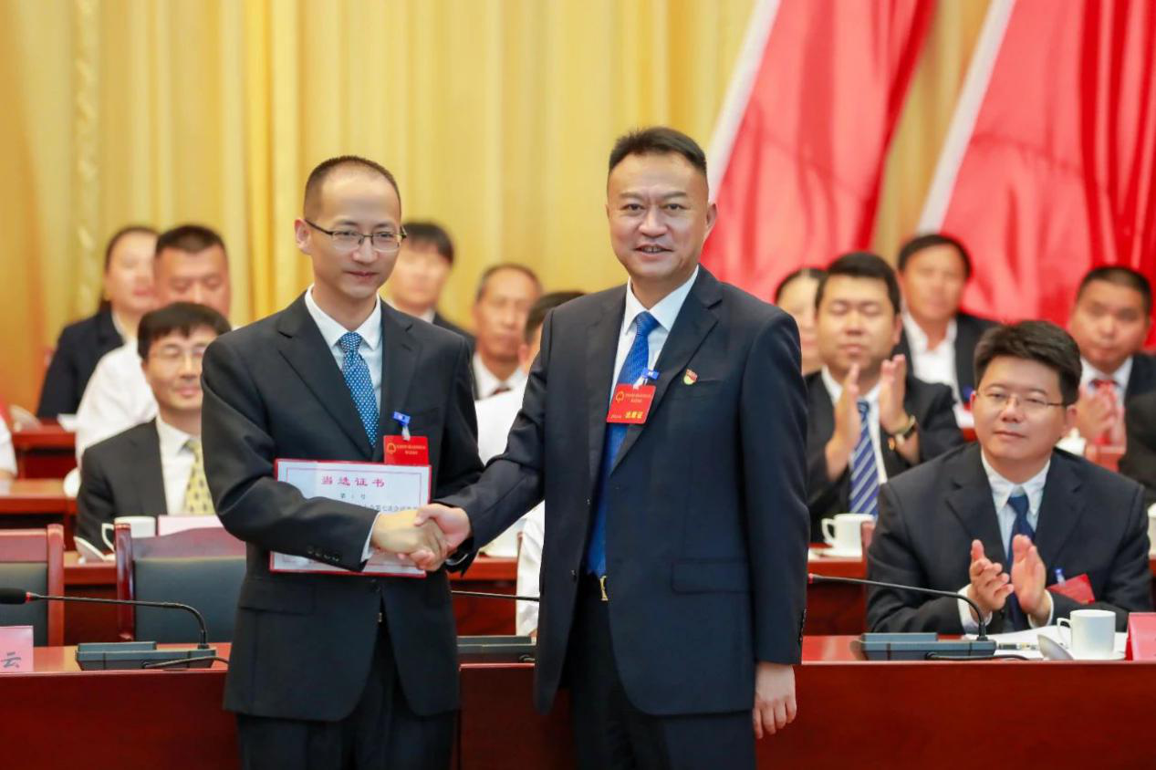 市委书记、大会主席团常务主席孔劲松为新当选的市人民政府市长解凌云颁发当选证书。