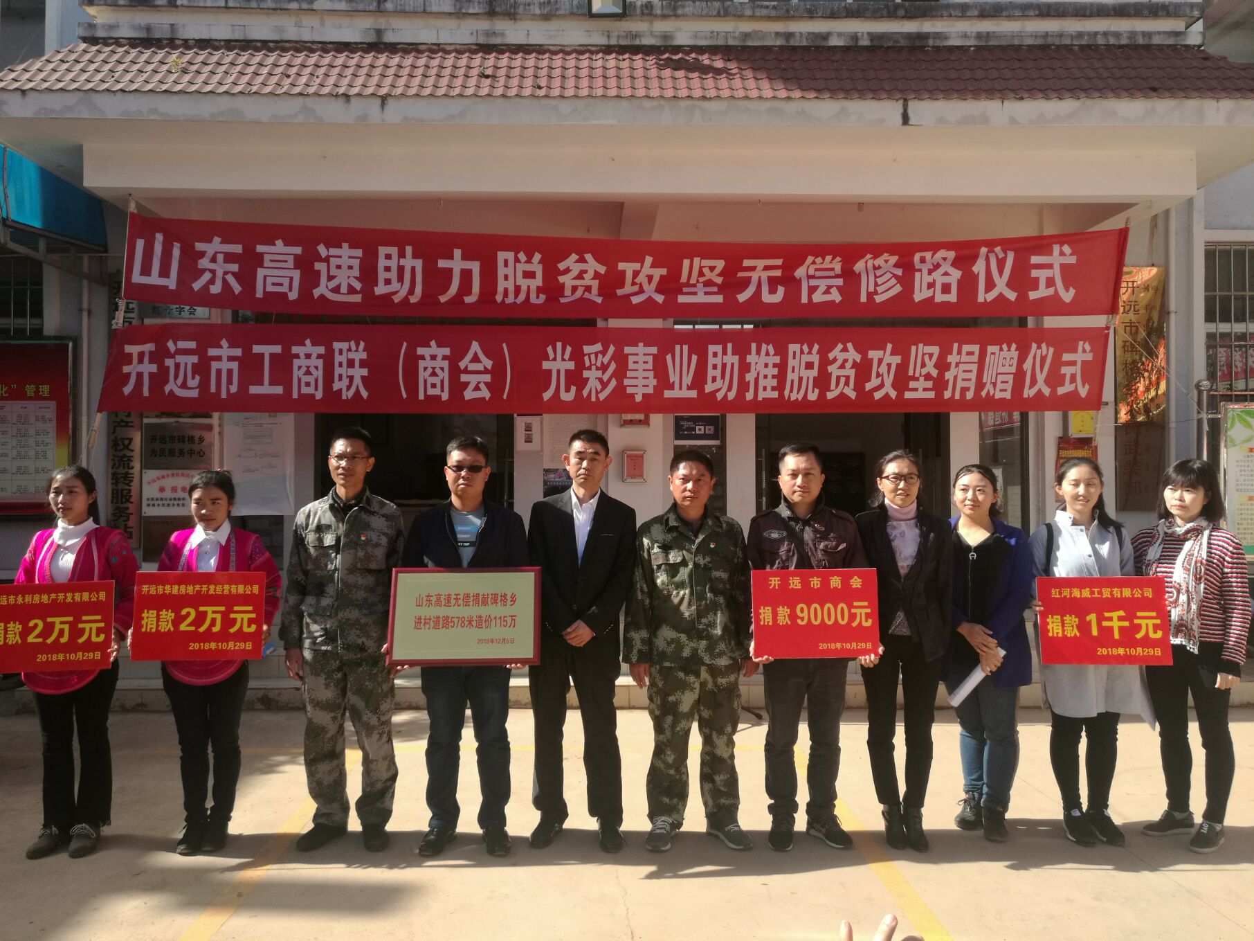12月6日,开远市工商联(商会)到碑格乡举行“光彩事业助推脱贫攻坚”捐赠仪式,与山东高速无偿修路仪式共同进行,市工商联(商会)会员企业及山东高速共筹款120余万元,助力碑格乡脱贫攻坚。据悉,此次的捐赠资金由市工商联会员单位,开远华建房地产开发经营有限公司、开远永利房地产开发有限公司、红河海威工贸有限公司、开远市商会、山东高速红河运营公司等多家企业捐赠。