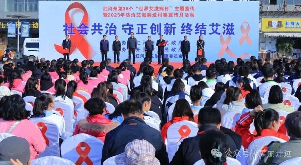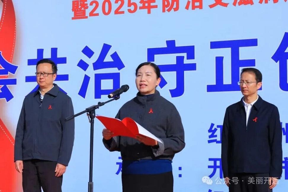 12月1日,红河州第38个“世界艾滋病日”主题宣传暨2025年防治艾滋病进村寨宣传月活动在开远市启动,今年的主题是“社会共治、守正创新、终结艾滋”。州委副书记、州长罗萍出席并宣布活动开幕,副州长周永瑜主持,市委书记解凌云致辞。