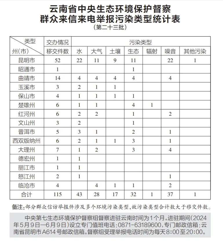 6月1日,中央第七生态环境保护督察组向云南移交第二十三批群众信访举报件115件,其中来电举报45件,来信举报70件。从信访举报件生态环境问题污染类型来看,涉及水43件、大气28件、土壤17件、生态32件、辐射1件、噪音37件、其他污染1件。从区域分布上看,昆明市52件、昭通市1件、曲靖市14件、玉溪市3件、保山市4件、楚雄州6件、红河州6件、文山州3件、普洱市5件、西双版纳州6件、大理州7件、德宏州1件、丽江市1件、怒江州2件、临沧市4件。截至当日,云南省已累计收到中央第七生态环境保护督察组交办的信访举报件2197件,所有举报件均已及时转交相关州(市)处理。