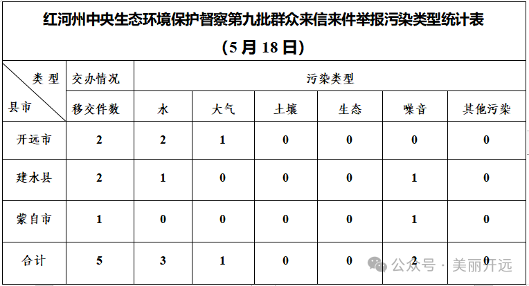 5月18日,红河州收到中央第七生态环境保护督察组交办的第九批群众信访举报件5件(其中来电举报2件,来信举报3件),涉及开远2件、建水2件、蒙自1件;从信访举报件生态环境问题类型来看,涉及水3件、噪音2件、大气1件(部分举报件涉及多个问题类型)。