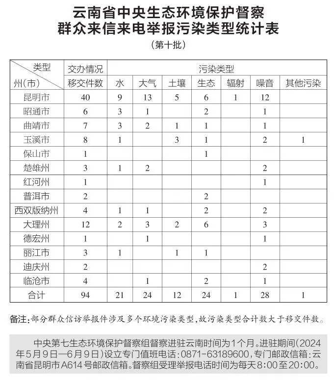 5月19日,中央第七生态环境保护督察组向云南移交第十批群众信访举报件94件,其中来电举报59件,来信举报35件。从信访举报件生态环境问题污染类型来看,涉及水21件、大气24件、土壤12件、生态24件、辐射1件、噪音28件、其他污染1件。从区域分布上看,昆明市40件、昭通市6件、曲靖市7件、玉溪市8件、保山市1件、楚雄州3件、红河州1件、普洱市2件、西双版纳州4件、大理州12件、德宏州1件、丽江市3件、迪庆州2件、临沧市4件。截至当日,云南省已累计收到中央第七生态环境保护督察组交办的信访举报件771件,所有举报件均已及时转交相关州(市)处理。
