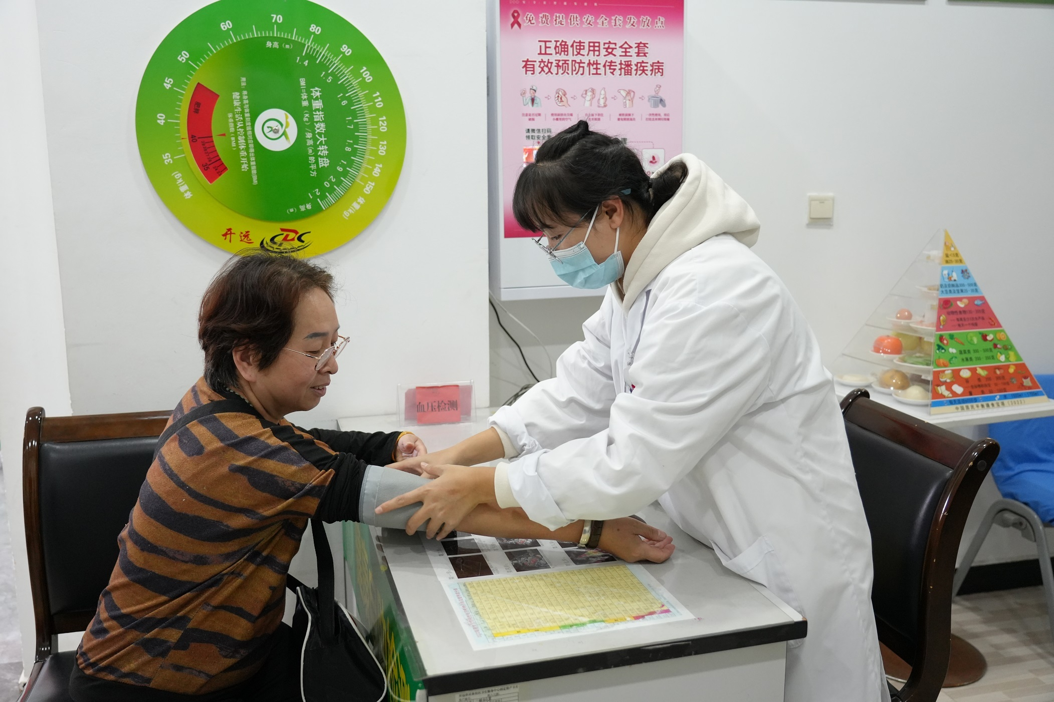 居民熊丽琼到社区医院测量血压(2023年12月5日摄)