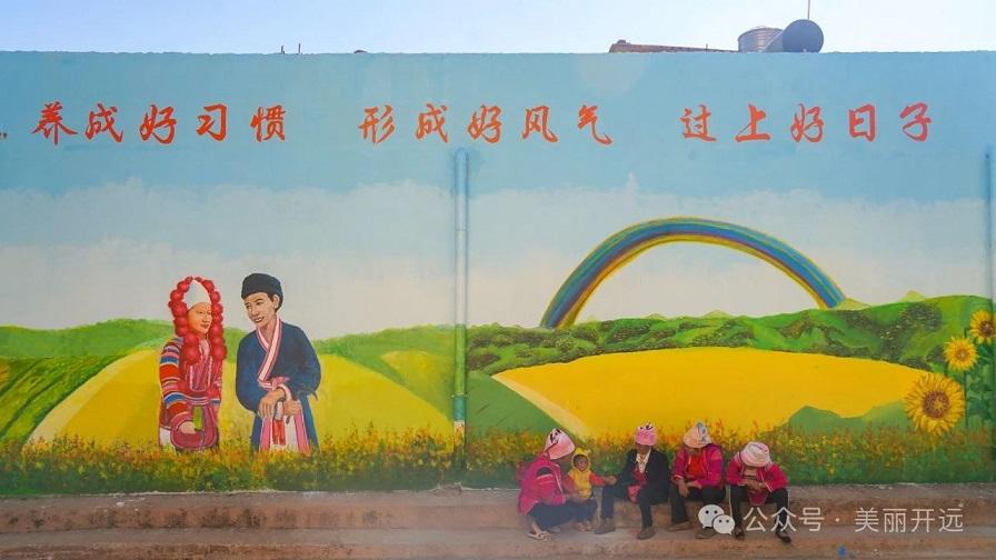 走进阿痴村,村庄宁静和谐,道路干净整洁,一幅构图巧妙、满是幸福的“美景画”映入我们眼帘——村民房屋的外墙上画着田园风光,一对彝族男女站在田间,仿佛在诉说着新一年的美好期盼。墙角处,几位身着民族服饰的村民悠闲地坐在石阶上,他们有说有笑,互相分享着家中趣事……此情此景,把乡村生活的恬静惬意展现得淋漓尽致。
