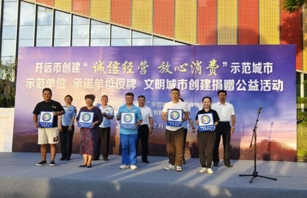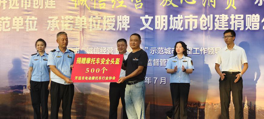 开远市南正印象运营管理有限公司和开远市贤嘉丽食品有限责任公司临江北路店两家企业做“诚信经营 放心消费”承诺表态,接受全市人民的监督。随后,活动现场为第一批创建成功的部分示范单位和承诺单位代表进行授牌,希望其珍惜荣誉,充分发挥模范示范作用,带动全市不断涌现出更多优秀的“示范单位”和“承诺单位”。活动最后,一心堂、开远市电动摩托车行业协会分别捐赠500份爱心大礼包和摩托车安全头盔回馈消费者,为营造安全放心的消费环境贡献自己的一份力。