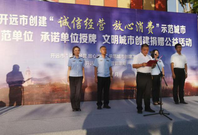 为持续推进“诚信经营 放心消费”示范城市创建工作,充分发挥模范示范作用,强化行业自律,营造安全放心诚信消费环境,7月25日,市市场监管局在体育创意产业园举行开远市创建“诚信经营 放心消费”示范城市示范单位和承诺单位授牌仪式。市人民政府副市长汪永安同志作讲话,州市场监管局相关领导,市创建工作领导小组各成员单位和部分企业、消费者代表共计130人参加授牌仪式。