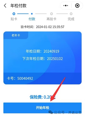 2、年检会产生相应的保险费用,点击开始年检,紧贴卡片于NFC识别处并完成支付,支付完成后,会跳转人脸识别页面,按指示操作完成认证